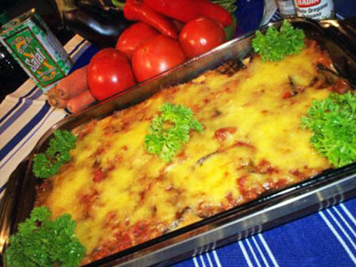 Engrasar un pirex 13 × 9 × 2, agregar salsa de tomate, capa de berenjenas, capa de relleno de quesos, capa de berenjena, terminar con la salsa. Si se desea se cubre con queso mozarella y parmesano.